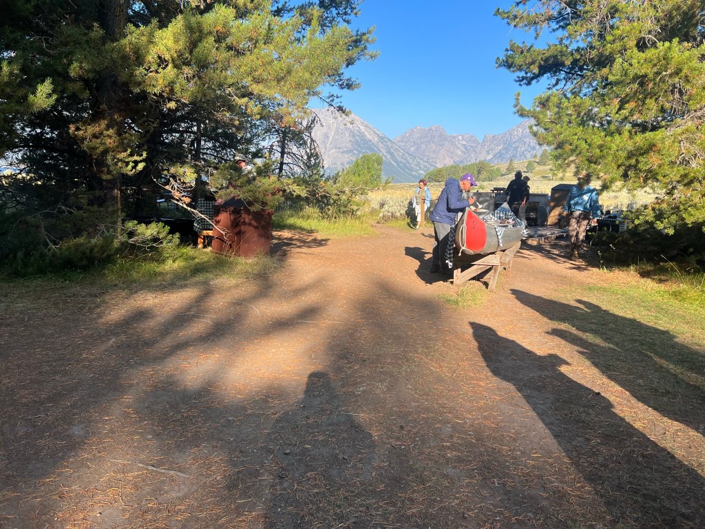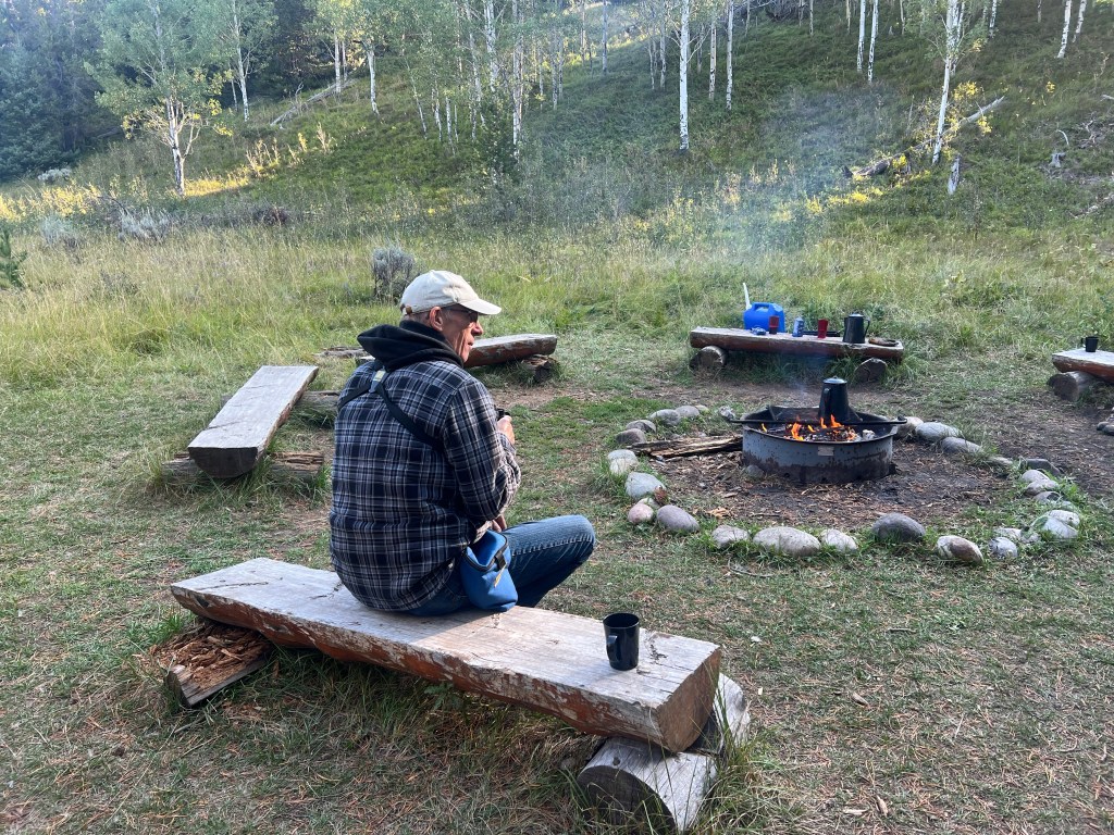 Breakfast was cooked by staff who came over at 6 am with all the food. It included trout, bacon, sausage, scrambled eggs, pancakes, lots of fresh fruit and yogurt with granola, and danishes/muffins. Along with juices and hot chocolate, there was cowboy coffee made over the fire. What they do is simply put the coffee grounds in the coffee pot and add water and boil it over the fire. Paul noted the “sludge” in the bottom of his cup as the grounds aren’t filtered out!