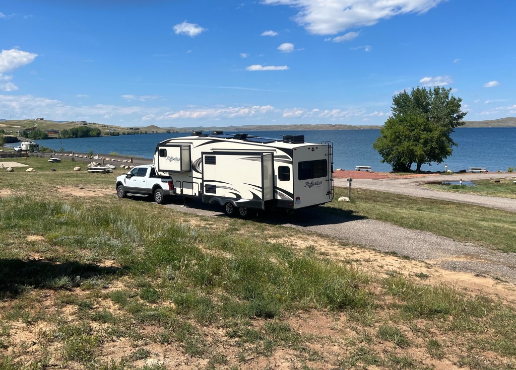 Since we were ahead of our schedule by a day, we had to find a spot for the night. The National Forest Campground where we are camping tomorrow night only had sites that were first come and it was about half an hour from Buffalo. We found a Recreation Area along side De Smet Lake with beautiful sites for only $15/night and were able to pull into a site with a view of the lake. It’s great stopping around 2 pm since you have much more choice of your site. The sun is shining bright and even though our fridge is running on electric, the solar is keeping up and we haven’t been draining our batteries!