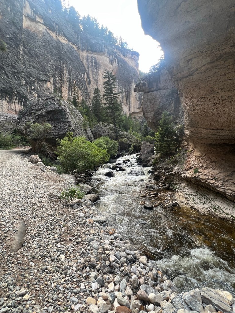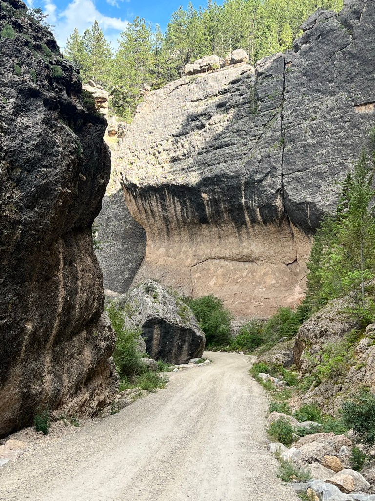 We then headed south on Hwy 16 to a scenic road that was recommended by the National Forest staff. Known as the Crazy Woman Canyon Road, it’s a one lane gravel road. On the advice of park staff, we drove in about 8 km before turning around. the stories are varied how it got its name. One says it was named for an Indian woman who lived alone in her teepee here and went insane. The other is a story of a settler who witnessed the violent capture and scalping of her husband and children and went insane. Regardless, it was a passageway for the Native Indians into the Big Horn MountainsI was a . The Crazy Woman Creek runs along the road for most of the way. It was a fairly busy road and there were lots of places to pull off and pitch a tent and have a fire. We did several set up.