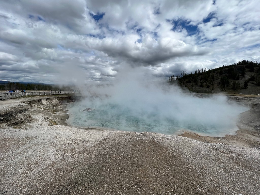 We also walked around some other trails to catch views of some hot springs and geysers. One geyser was Excelsior Geyser which is dormant. It had gone dormant in 1890 and then in 1985 erupted for 47 hours. It has remained dormant since. However, the geyser continues to pump out about 4000 gallons of water per minute, creating a colourful runoff.