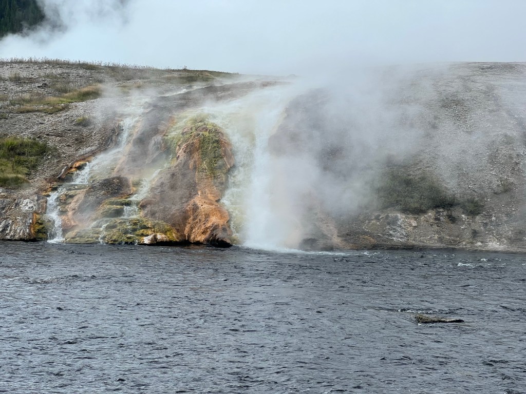 The different colours in the runoff are formed in different ways. The yellows are from sulphur, browns and reds from iron and greens and blacks are from algae and heat loving bacteria. One spectacularly coloured spring is Prismatic Spring. Best views are seen from the air, but since we can’t do that, our view at least gives the hints of colour.