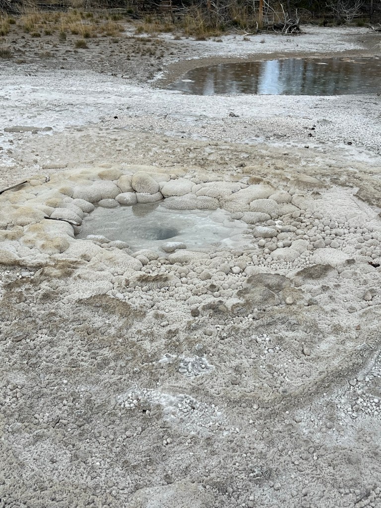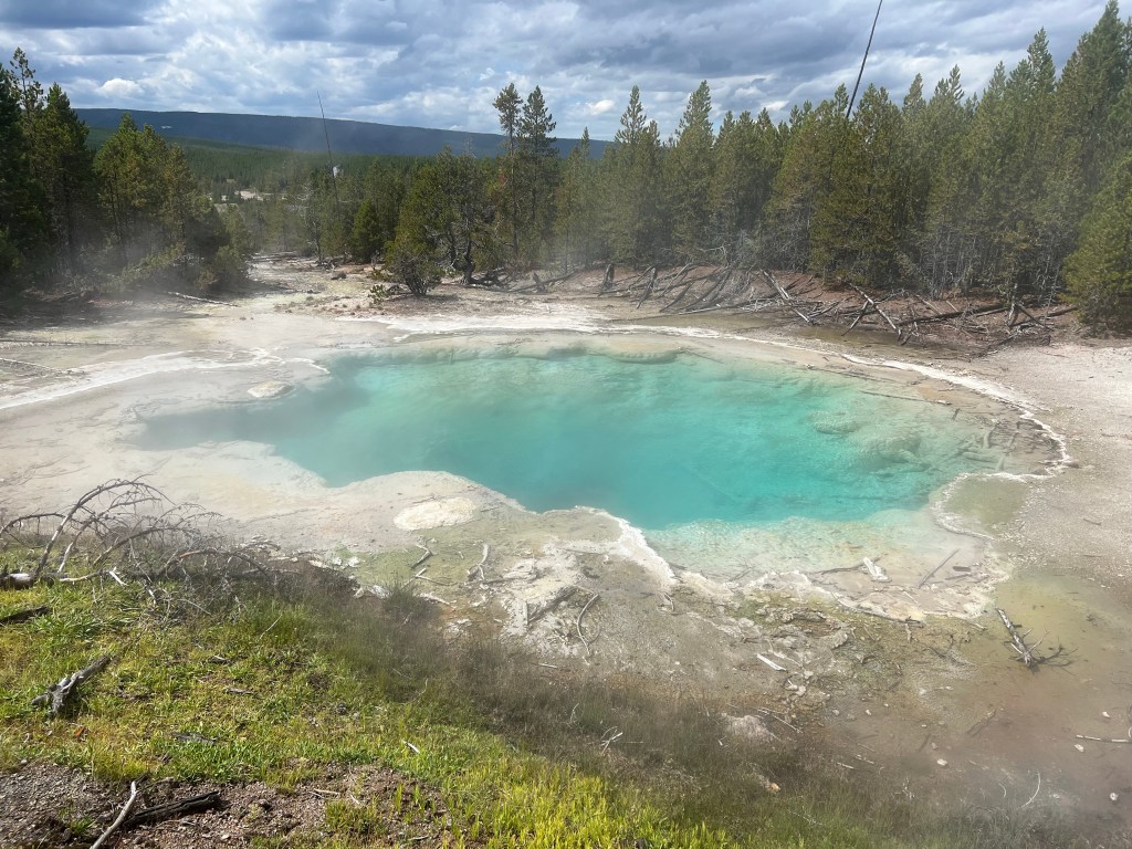 Today’s destination is Old Faithful, the first geyser in Yellowstone to be named. It has erupted every 44 to 120 minutes since 2000. In 1872, Yellowstone became the first National Park in the United States to protect all the geothermal features found there. For many years, only the rich could go, initially taking the train to West Yellowstone where they then boarded stagecoaches which took them into the park. In 1903, the Old Faithful Inn was built and opened to guests in 1904. It still stands today and we were able to take a tour of it. It survived the 1988 wildfires that destroyed about half the park. Although a dozen cabins burned, the Inn managed to escape the fire.