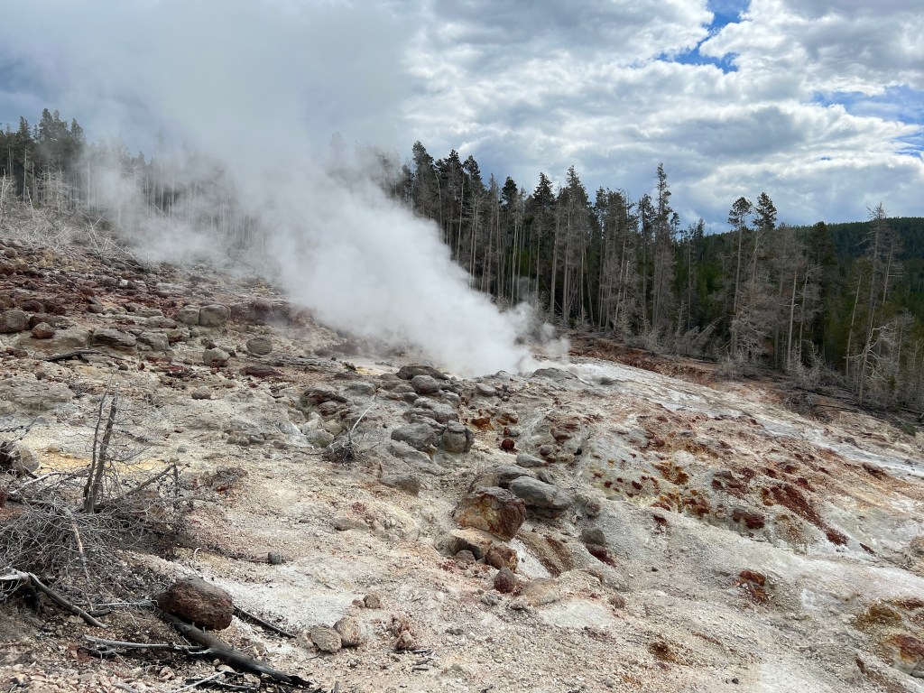 The different colours in the runoff are formed in different ways. The yellows are from sulphur, browns and reds from iron and greens and blacks are from algae and heat loving bacteria. One spectacularly coloured spring is Prismatic Spring. Best views are seen from the air, but since we can’t do that, our view at least gives the hints of colour.