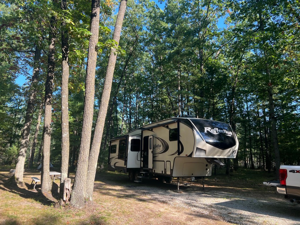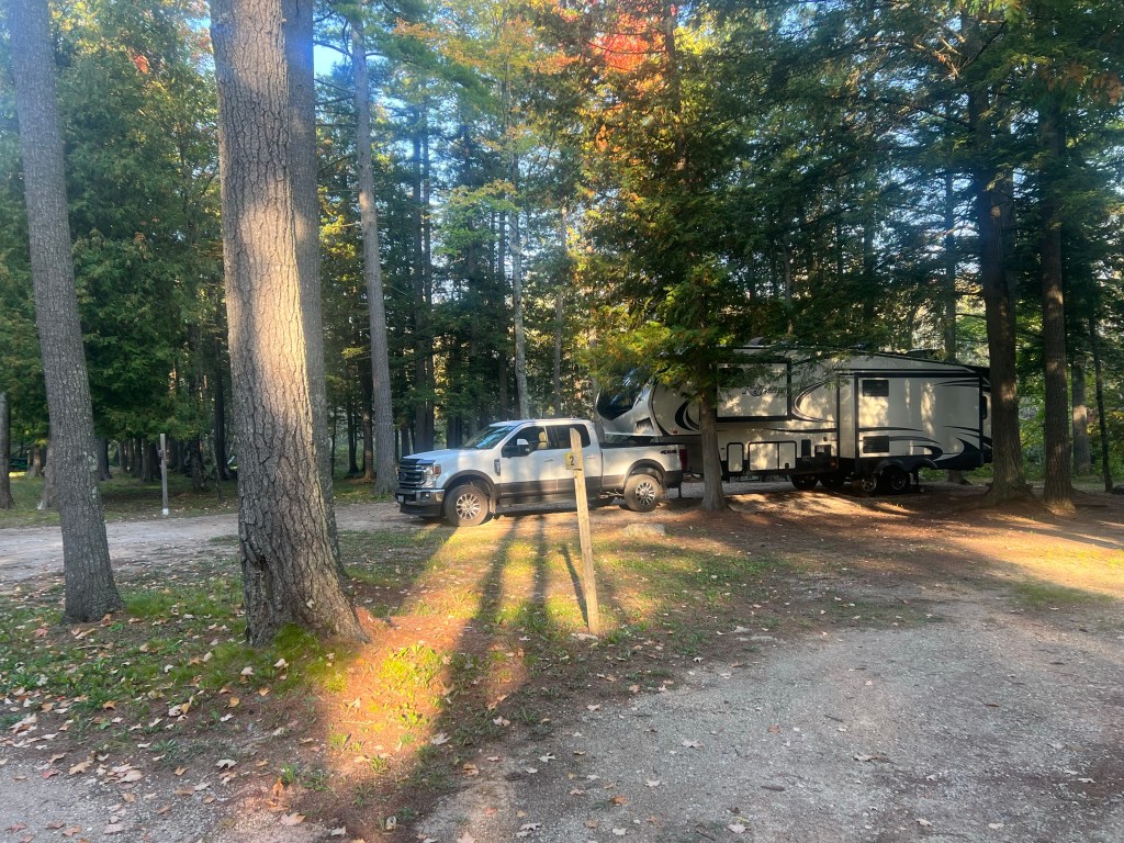 Last night (Thursday) was a later night. We pulled into a small community park in Michigan just after 6:30 but we were only a few miles from the time change point so by the time we were parked it was getting dark. We had the whole place to ourselves – about 10 campsites along a stream.