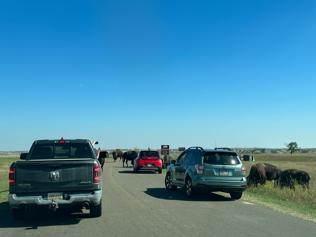 Before we were able to even park, however, we had about a 15 minute bison jam. The bison just go where and when they want. Combined with the fact that people want pictures, it results in a traffic stand still!