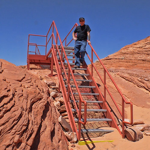 At the end of the canyon was about a mile long walk. Some was a covered metal walkway uphill, some a more level trail and the final was a number of flights of metal stairs down back to the van.