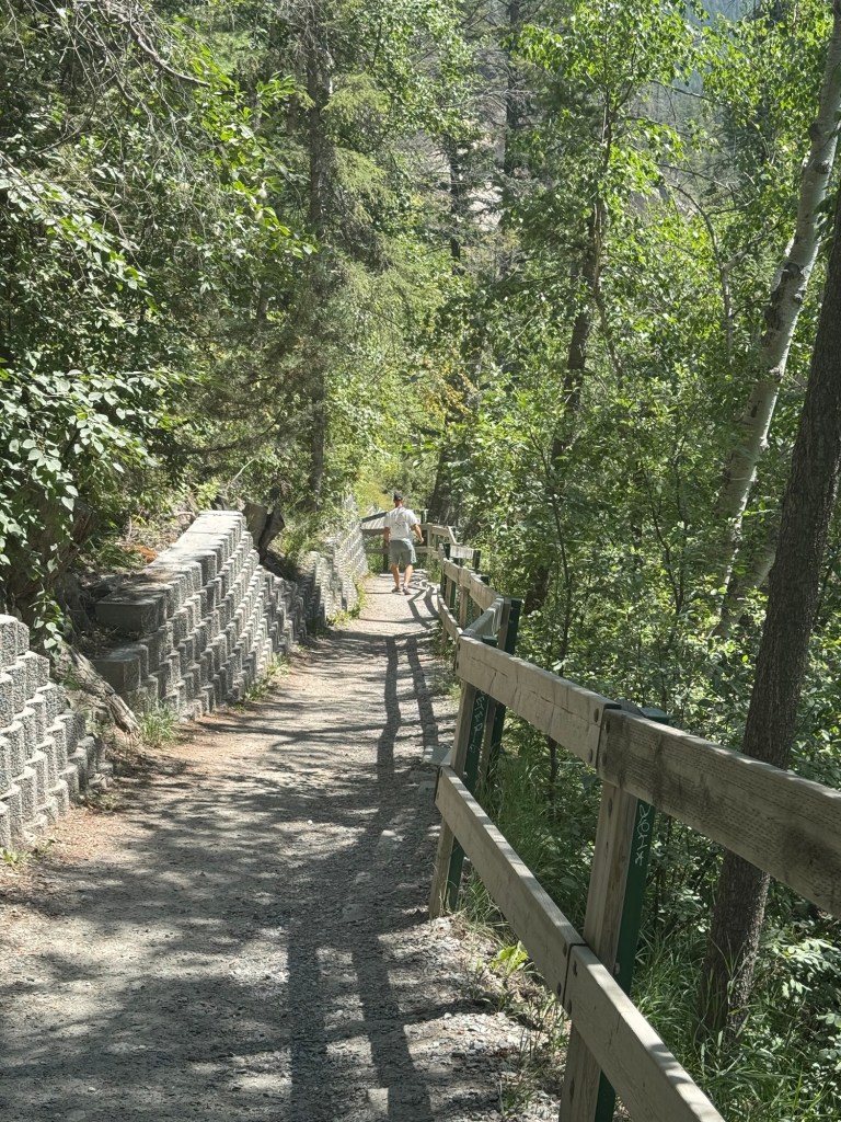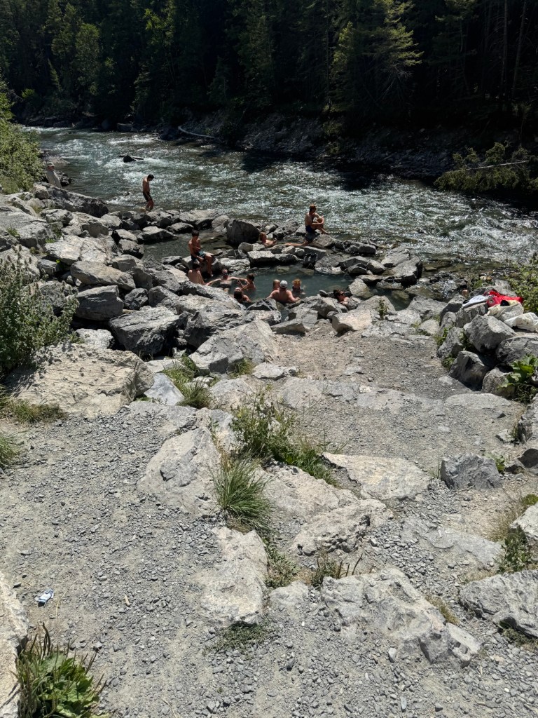 There are two pools at Radium – the hot one which ranges 102-104 degrees F and then the other which is around 84 degrees F. Sue to the heat wave the hot pool was more like 104 so our time in it was for shorter periods.