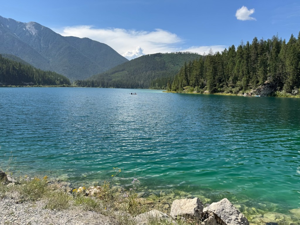 We got to the hot springs and got out to check things out. There was a 5 minute downhill walk to get to the hot springs. Paul went down to check it out. He returned with the news there were a couple of problems. One was the horse flies that were biting. There was no shade and the way to get in the pool would be difficult for Joyce. We decided to have lunch and then we headed on to the developed part of the park. The park has two small mountain lakes.