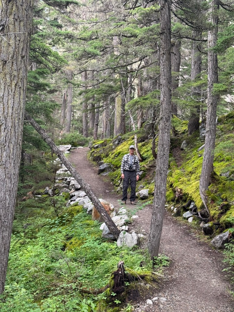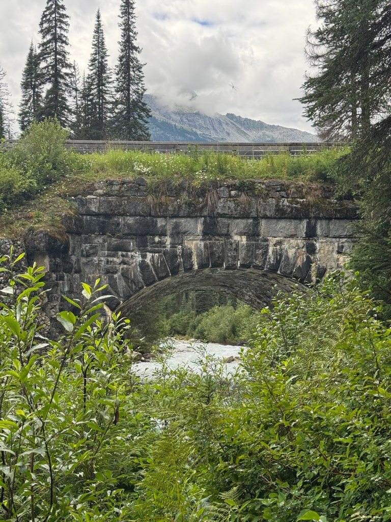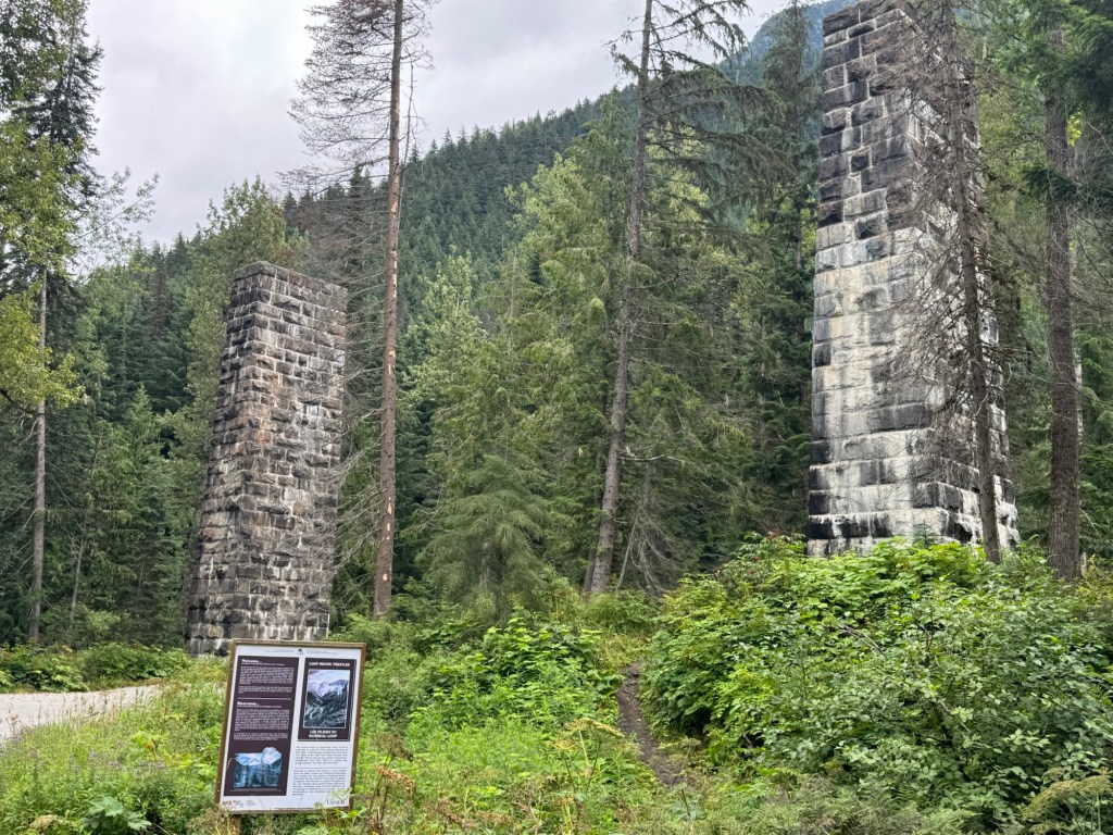 There was a small campground with a trail head where we stopped for a few pictures of some stone pillars built in 1908. Originally this was a wooden trestle bridge built in 1885 in several loops to allow the trains to climb into Rogers Pass at a reasonable grade. The stone pillars were built under the wooden trestle and then the wood was replaced with steel spans. However, eight years later, the CPR abandoned this area of the railway and the pillars were left as monuments to the skill of those who built them.