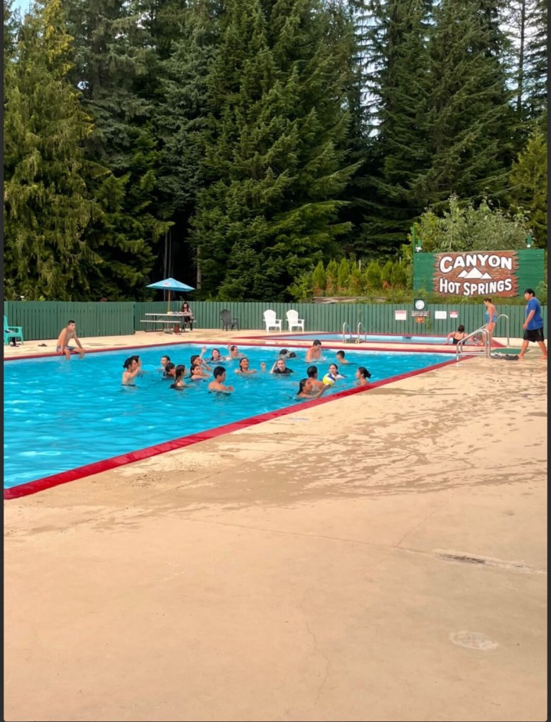 After returning to the campground and having supper, we headed to the hot springs. There are two pools, one 104 F and the other cool pool about 86 F. They aren’t busy as it is mostly campers using them.