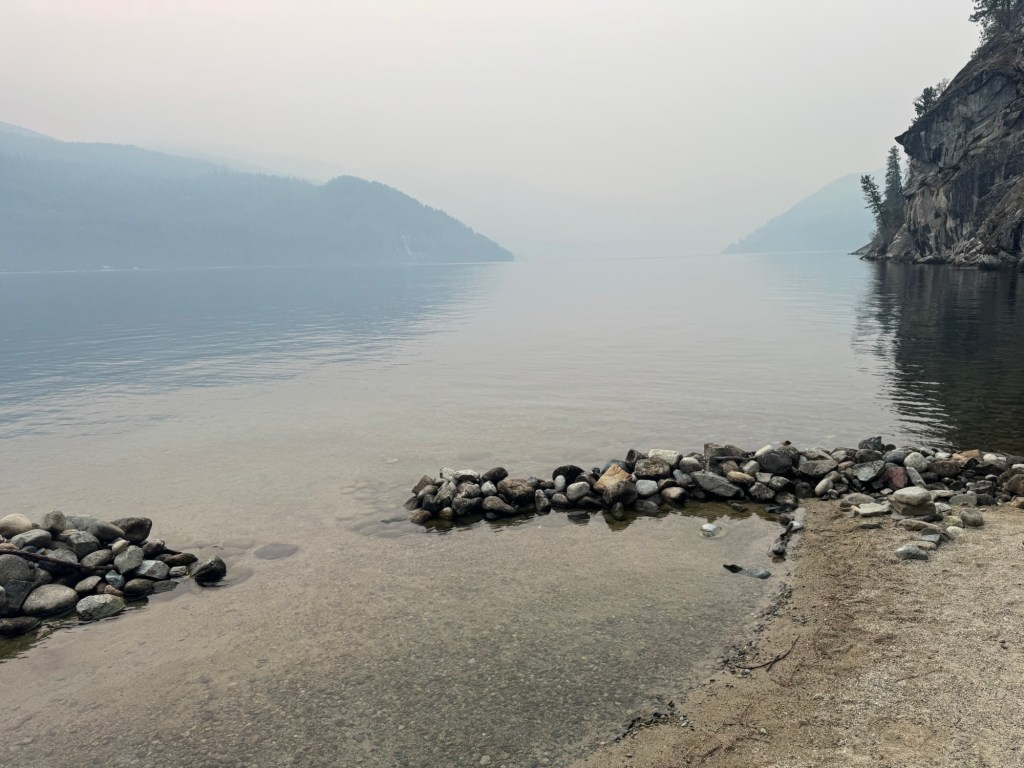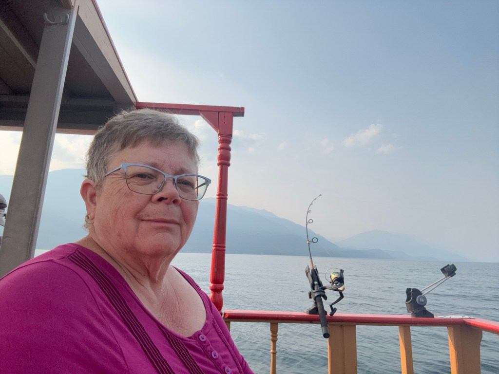 It was sunny and a relatively calm day to be on the water. However, the smoke from the wildfires was back in the air so it wasn’t as clear. After some initial safety instructions, we were on our way. Joyce had bought a one day fishing license since we had heard the Rainbow Trout were biting along with Dolly Vardens, so we had a slow cruise up the shore while she trolled.