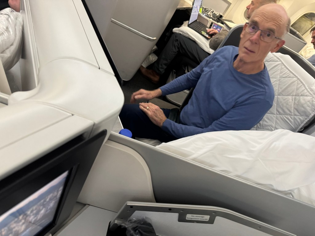 The Maple Leaf lounge was a real treat. We had a couple of hours until boarding and breakfast was a long time ago, so we took advantage of the selection. Roasted green beans and garlic, roasted potatoes and tender pieces of chicken in a cream sauce. Add in salad and some dessert treats (carrot cake, brownies and about 4 kinds of cookies including Paul’s fav, white chocolate macadamia) and whatever you want to drink and great wireless and the time flew by.