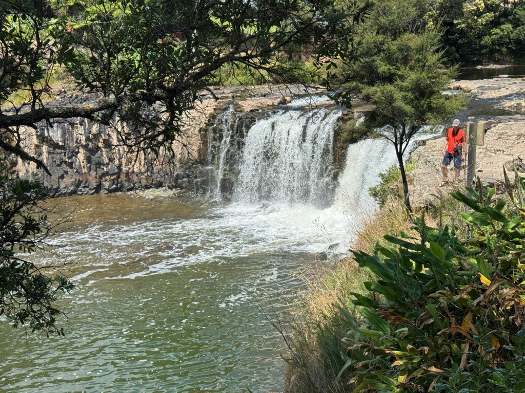 Thursday morning we took advantage of being able to cook and made bacon and eggs and toast. Then we set out to explore the area. We had originally planned to take a 4 1/2 hr boat ride in the Bay of Islands, but the weather was calling for clouds and rain, even thunderstorms. Neither of us felt like spending nearly $200 each (it included a buffet lunch on one of the islands) so we figured a self-driving route was the best alternative. Enroute to the coast, we happened upon a waterfall so we stopped and went the the lookout to get a view.