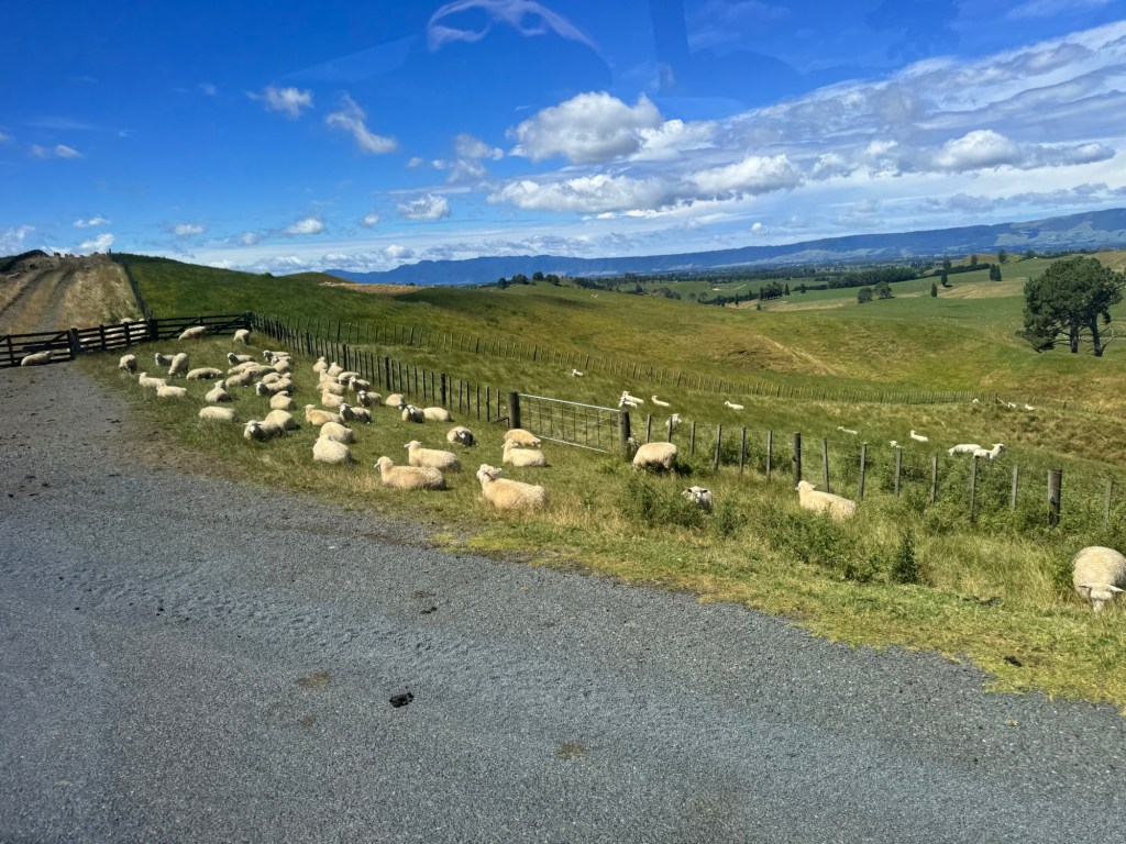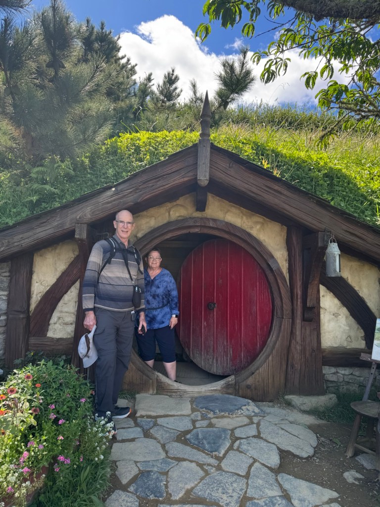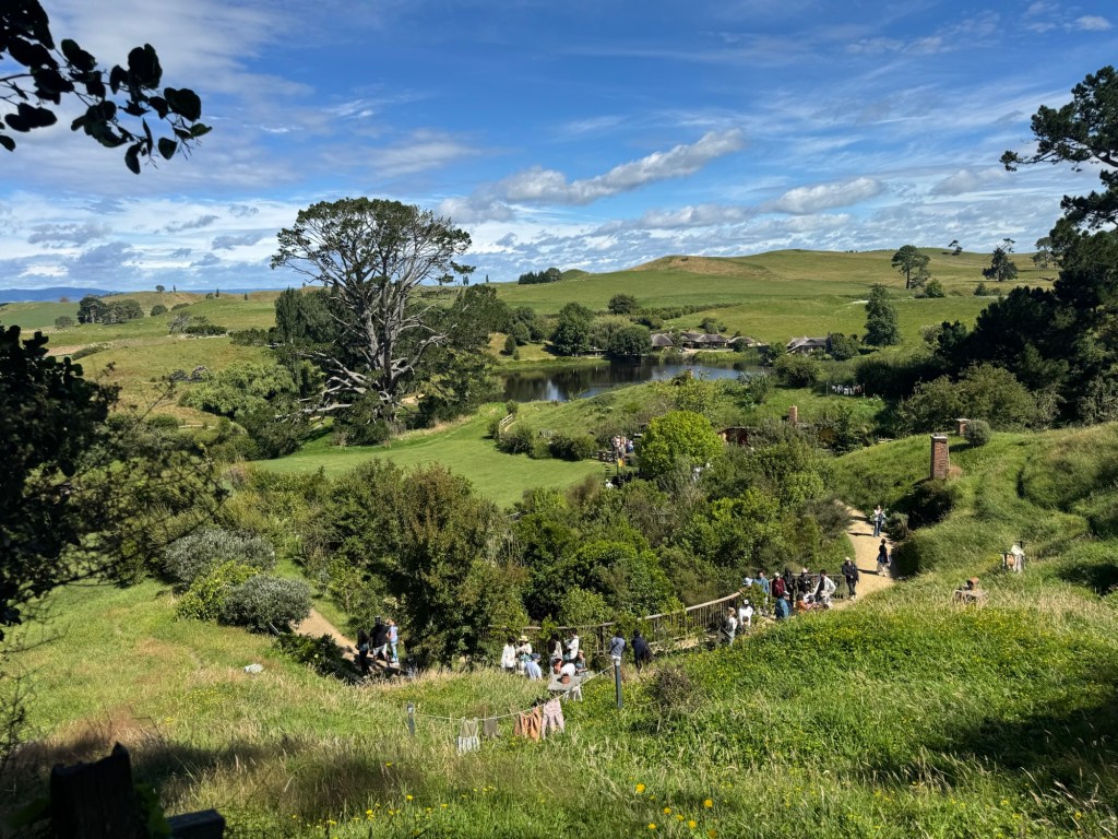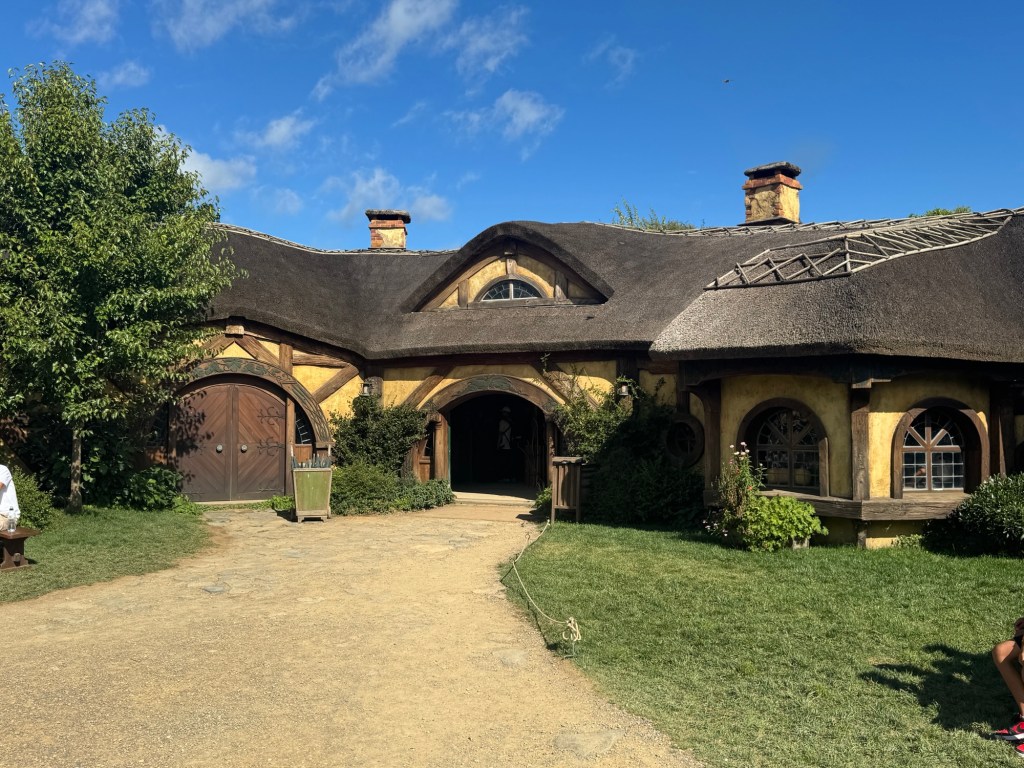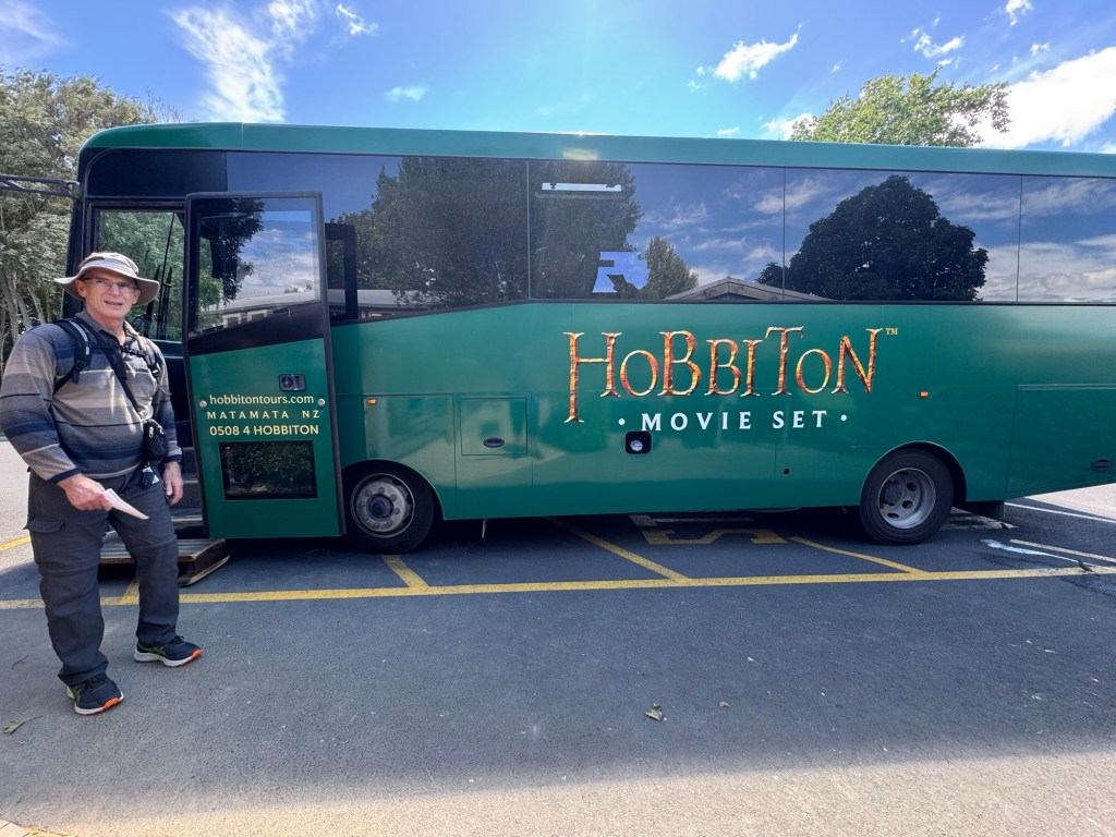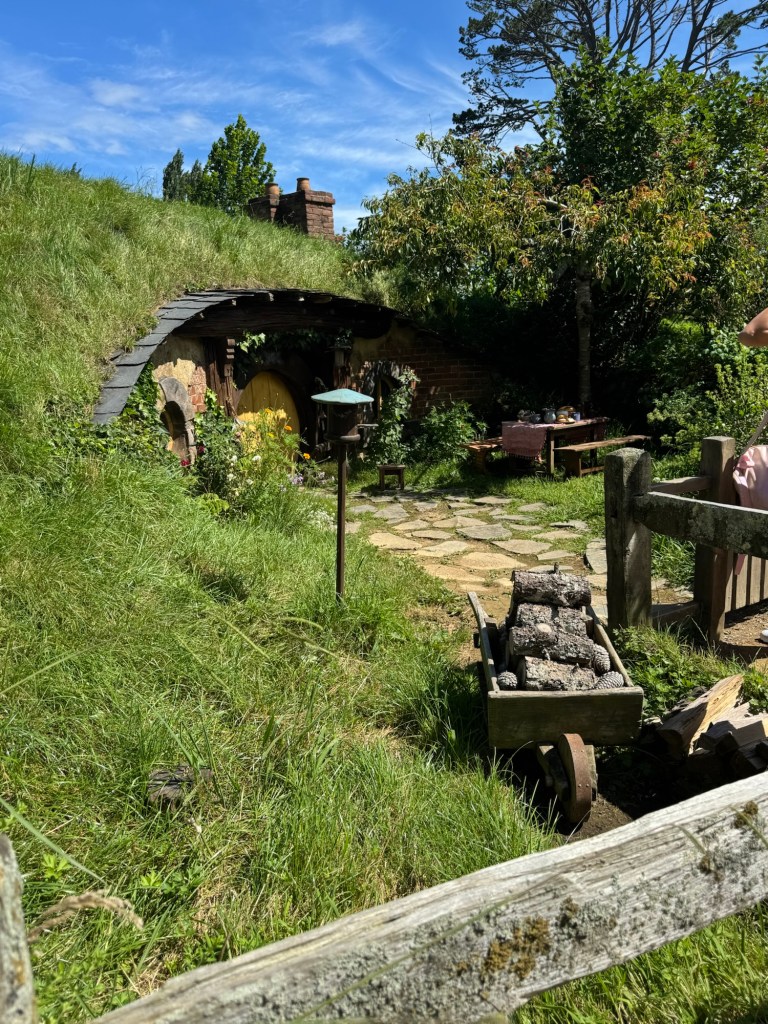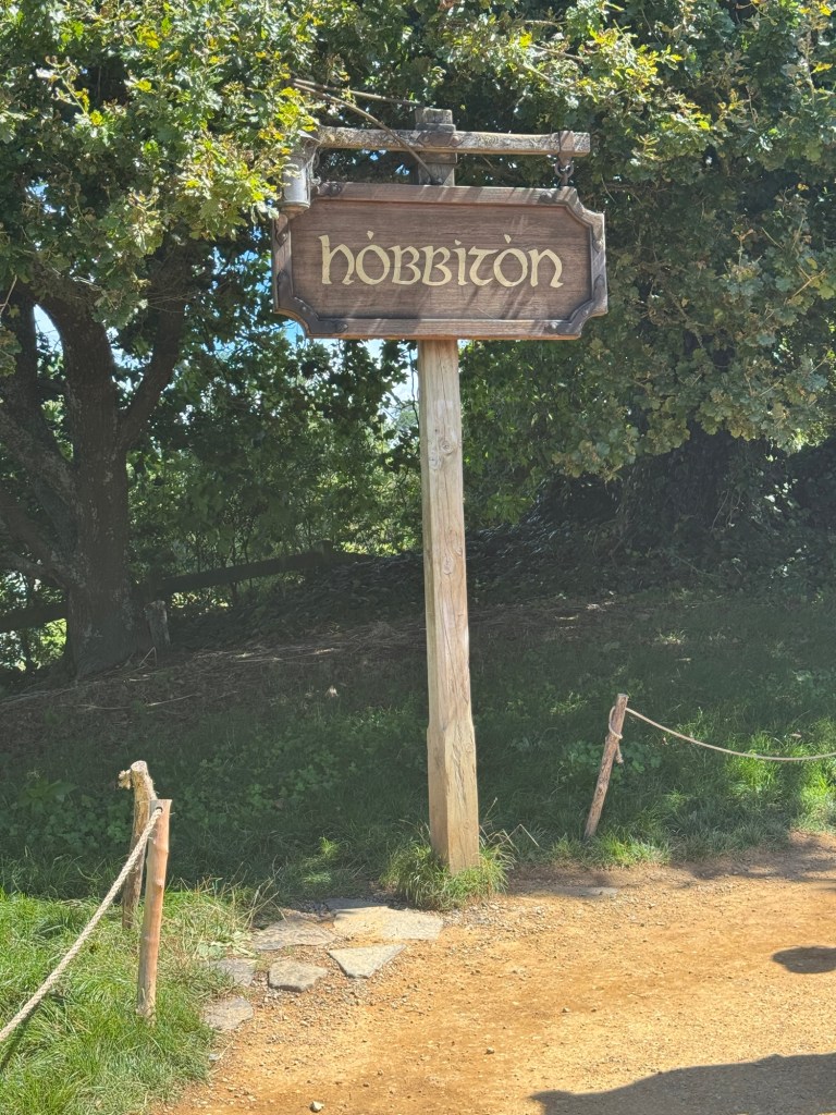 Our journey began with a 10 min coach ride from the reception and parking area to The Shire where filming of the Lord of the Rings and The Hobbit trilogies took place. This was and is a sheep farm. In 1998 the director of the movies was doing an aerial search for a location to film these movies when he saw this farm. By 1999, they began preparing the area for filming, including the building of a 1.5 km road built by the New Zealand army!
