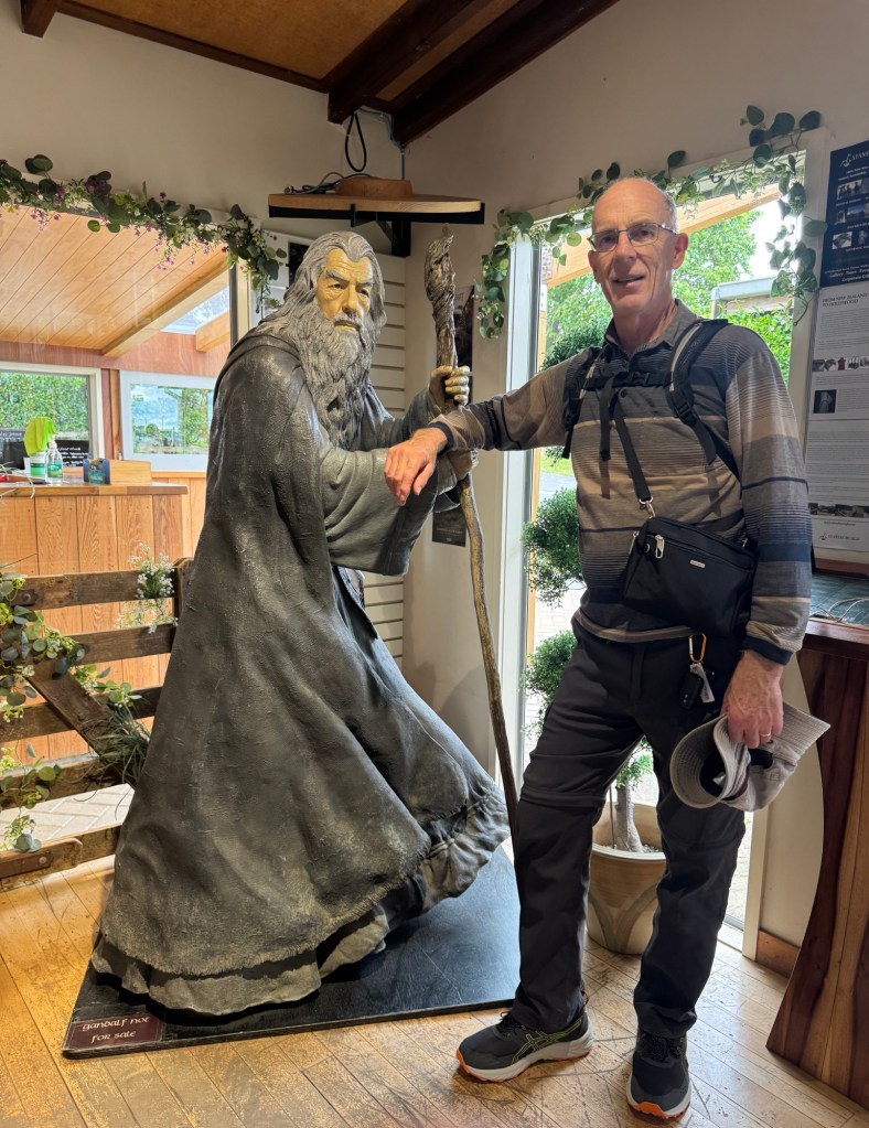 Our tour guide, Anna, was from Germany; here for a visit initially, but now waiting on papers to allow her to stay longer. She took us on a walking tour for just over an hour. She talked about some of the movie techniques that were used in filming because the “hobbits” were seen as so short and Gandalf was so tall. Some filming was done with a 3 m gap between the “hobbits” and Gandalf which gave the height differential needed. They used another person from New Zealand who was over 7’ tall, augmented by sculpting features to film Gandalf from a distance too.