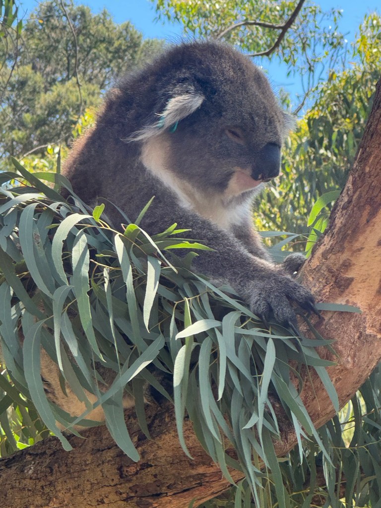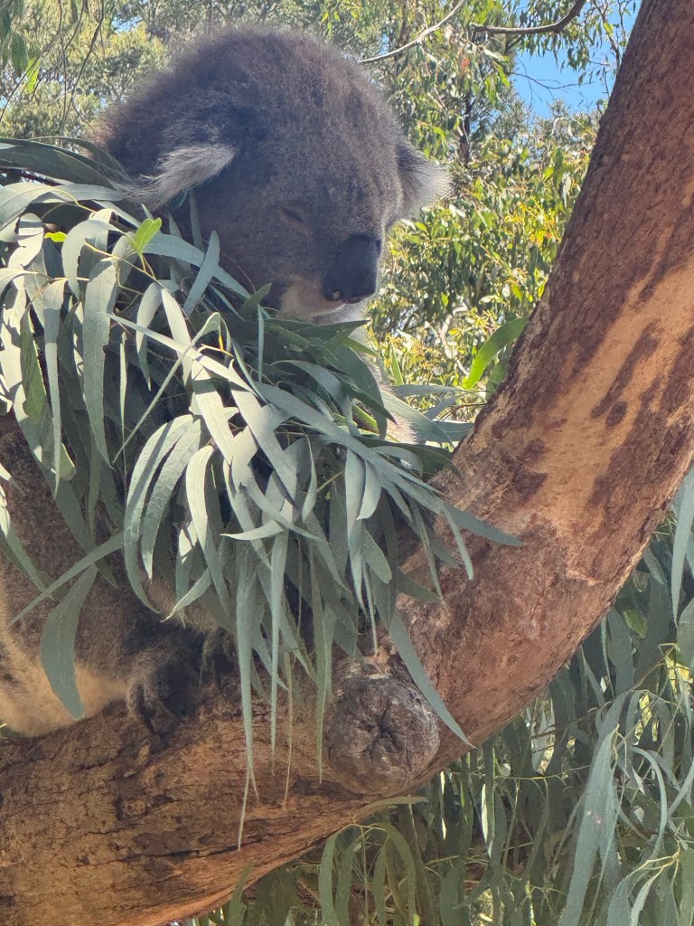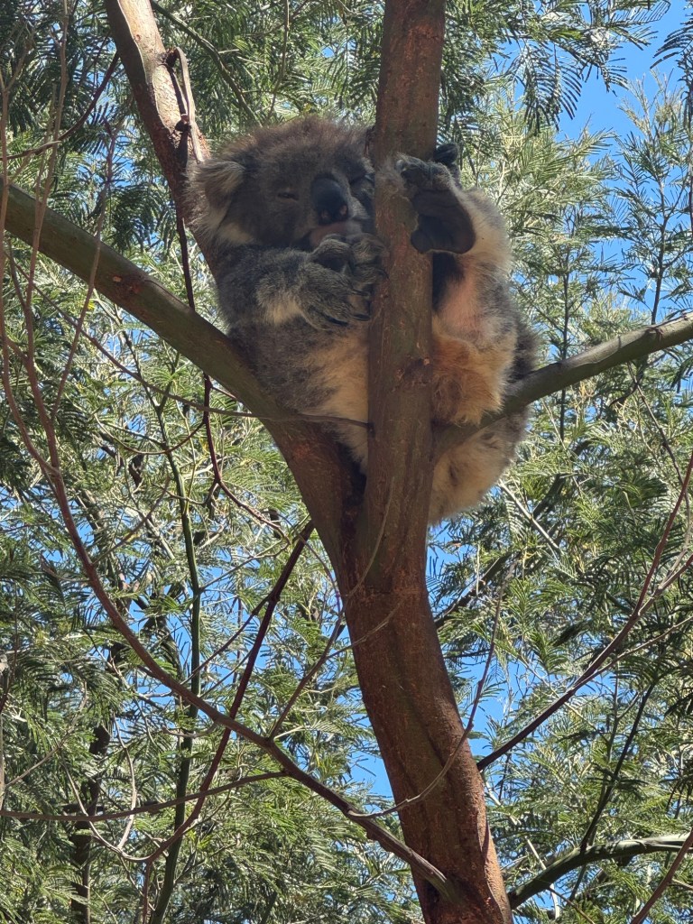 On Monday morning we headed to the Phillip Island Koala Conservation Reserve. Visitors fund the vital research, conservation and education work done there. Staff care for over 1,980 hectares of beaches, bushland and wetland reserves on Phillip Island. We had a brief intro by one of the staff and then headed to the boardwalk to look for koalas. They are divided into two areas. One is for the “retired” koalas who are no longer reproducing but haven’t died yet. The other area is where the younger koalas live and mate.