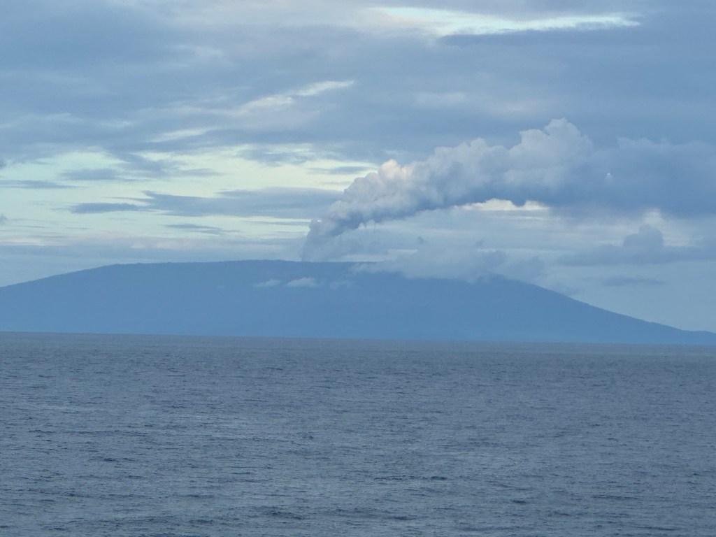 Leaving Vanuatu we saw steam arising from an active volcano on one of the many islands making up Vanuatu. Since sunset was approaching before we were out of the area, the captain told us we might see the orange glow from one of the other more recent volcanoes. We went out on deck at the appropriate time and despite being out for about half an hour, we didn’t see the glow she had told us to watch for. Without active cellular or wifi connection, we were unable to know when we were passing the actual volcano location.