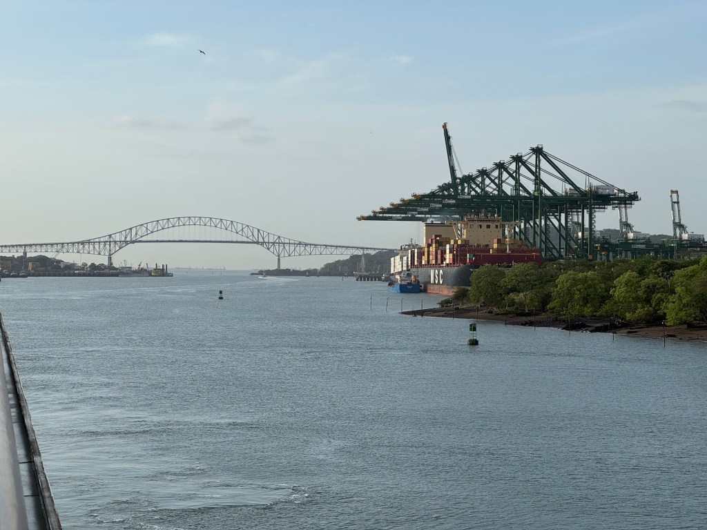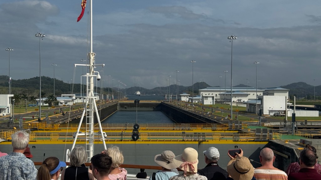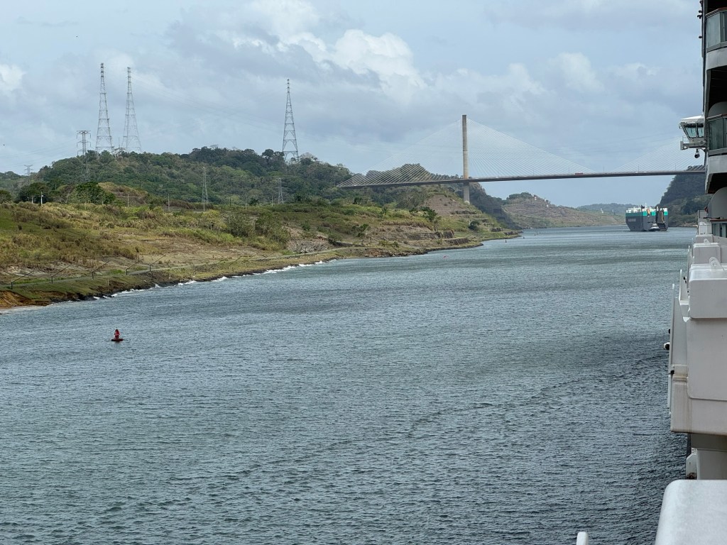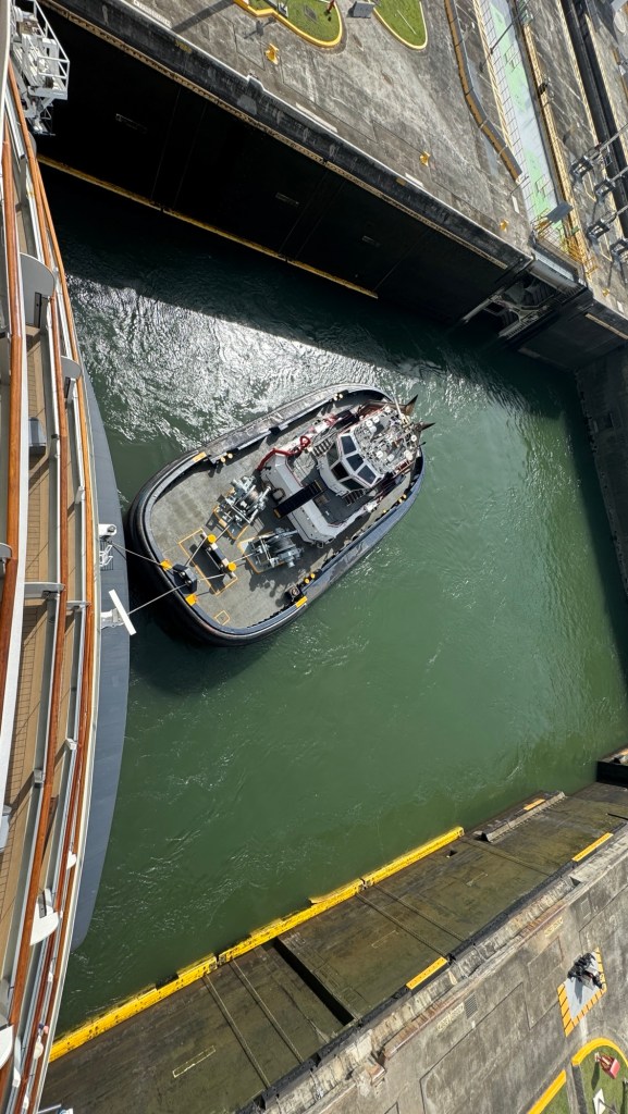 In order to go through the locks, our ship had to bring their lifeboats in and partially onto the promenade deck since they aren’t allowed to have anything outside of the sides of the ship. It takes about 2 1/2 hrs just to get through the first 3 locks. Then we made our way through the canal unti we were in Lake Gutan. as we made our way to the far side of the lake, we had a couple hours wait for our pilot to arrive and take us through the last set of locks to the Atlantic Ocean.